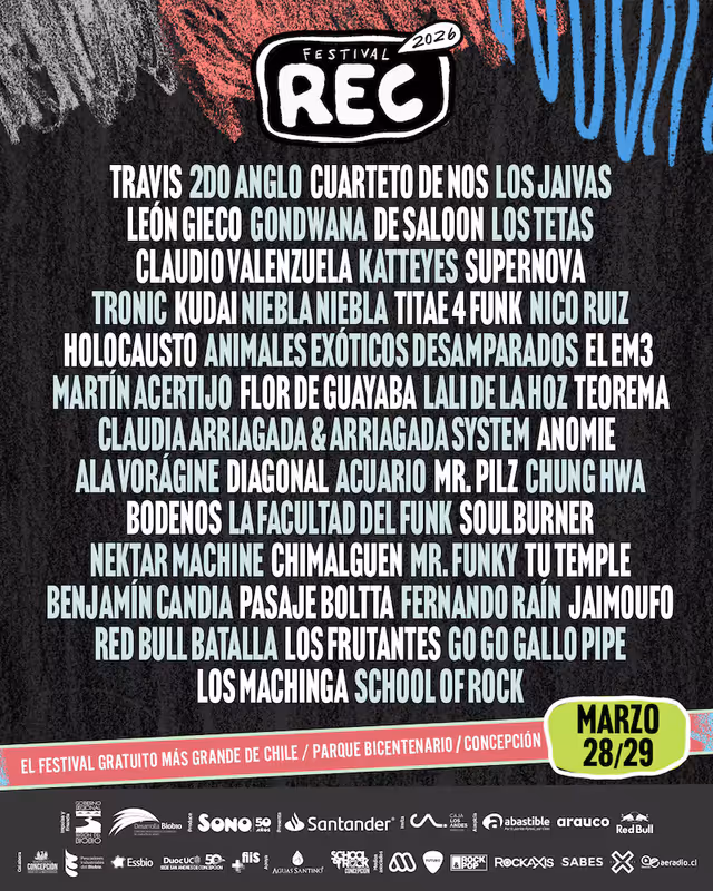 Artistas confirmados Festival REC 2026: Travis Cuarteto de Nos León Gieco Los Jaivas Gondwana De Saloon Los Tetas Claudio Valenzuela Katteyes Bandas y solistas regionales del Biobío (seleccionados por convocatoria y curatoría local)