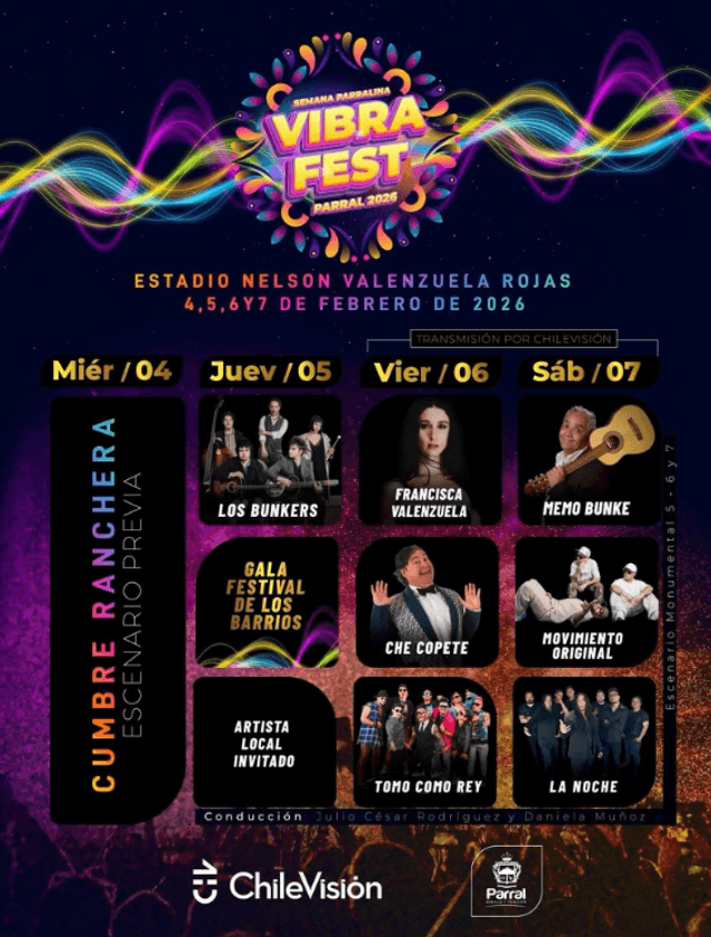 Parral se prepara para vivir una nueva edición del Vibra Fest, evento musical que se desarrollará en el marco de la Semana Parralina 2026 y que contará con una programación gratuita orientada a públicos diversos. La parrilla artística confirmada reúne a destacados exponentes de la música nacional, combinando rock, pop, urbano y música tropical, además de espacios dedicados a DJs y artistas locales.